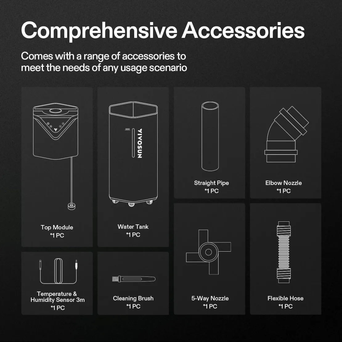 - Versatile Applications: Includes a comprehensive set of accessories— a 5-way nozzle, an elbow nozzle, a flexible hose, and a straight pipe—ensuring adaptability to any setting. It’s ideal for grow tents, grow rooms, living rooms, bedrooms, and beyond.