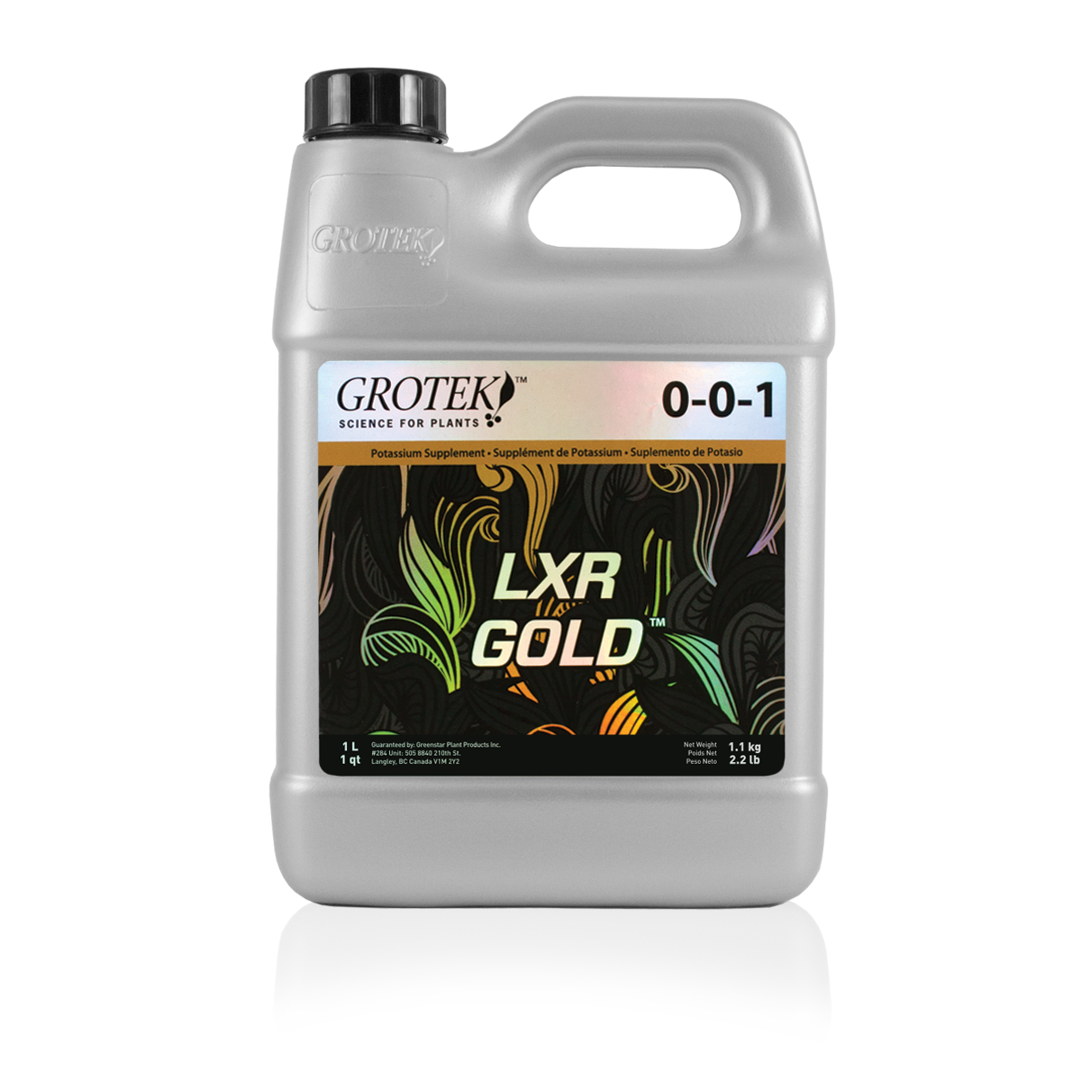 Grotek LXR Gold is a potassium supplement for quick results when your plants show a deficiency in potassium (brown scorching and curling of leaf tips, reduced plant growth, root development, and seed or fruit development).